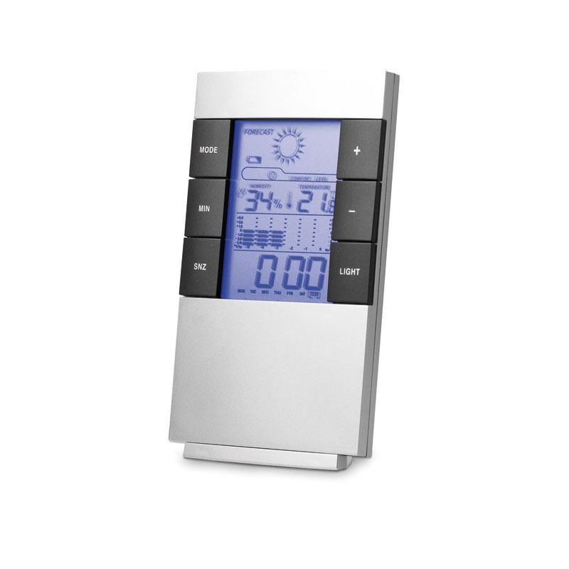 Desk weather station and alarm clock with snooze function, date and day, backlight, C/F thermometer, hygrometer and weather forecast.