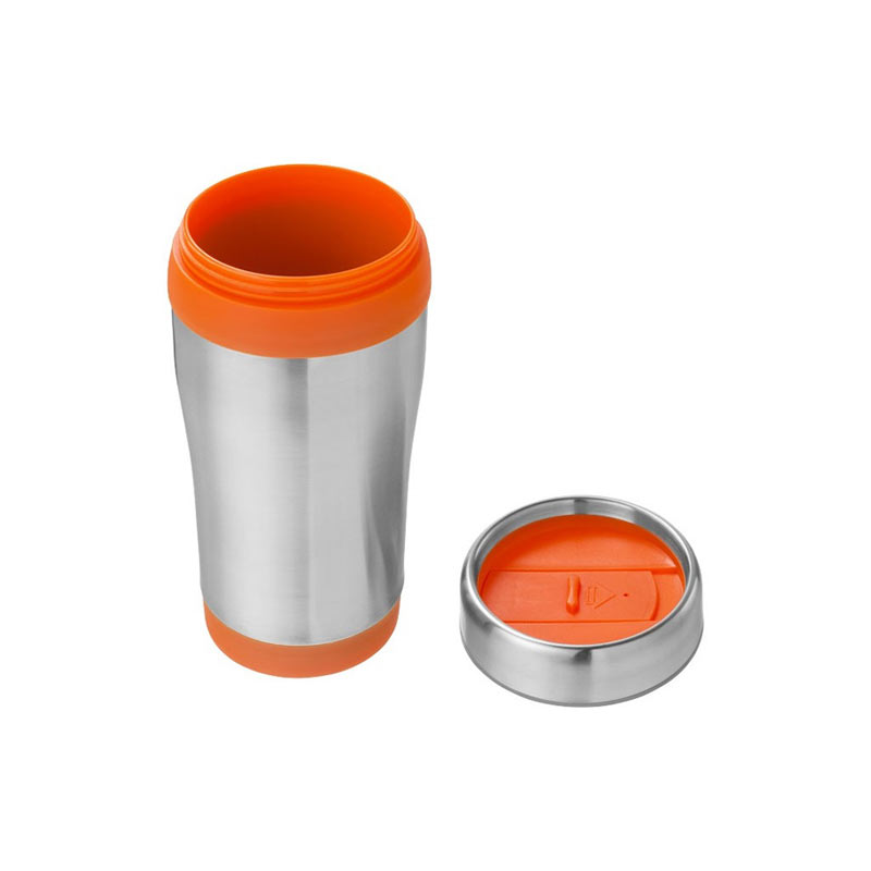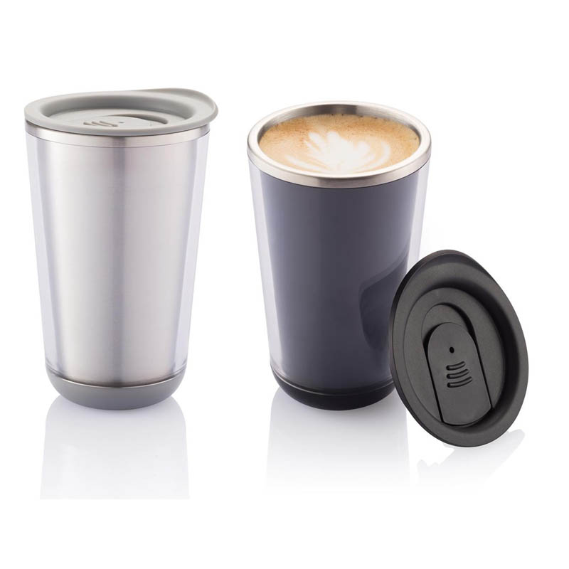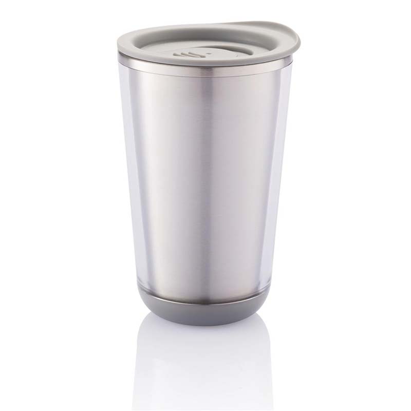 A double wall stainless steel thermal mug.
