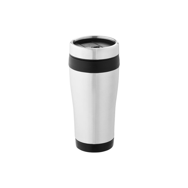 Double walled mug with twist on thumb slide lid. Volume capacity is 470 ml. Stainless steel exterior and plastic interior.