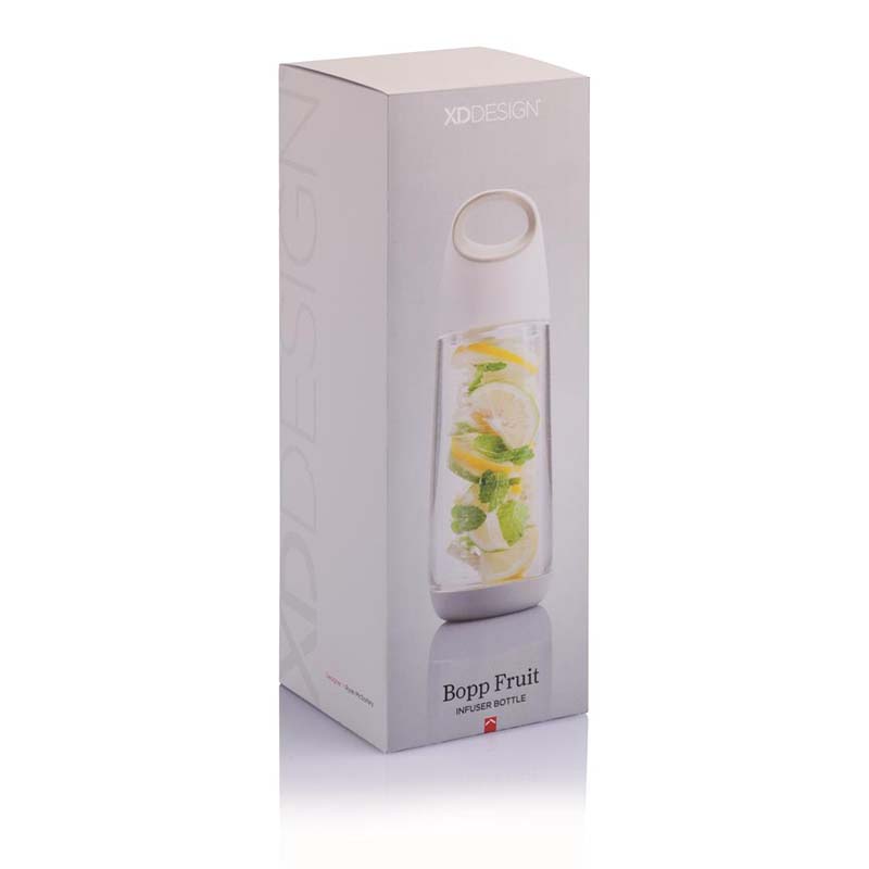 XD Design Bopp Fruit Infusion Bottle helps you with your daily intake of water and vitamins. The fruit basket reaches to the bottom of the bottle allowing for a maximum infusion. The iconic colored opening on top makes is easy to carry the 650 ml bottleso you can enjoy your infused water anywhere you like. The use of Tritan material keeps wear and tear to a minimum, making Bopp fruit very durable. Registered Design.